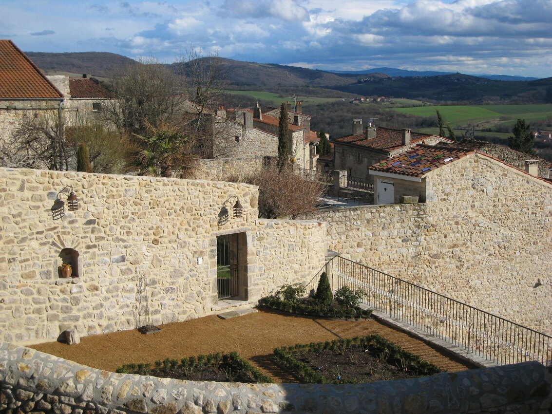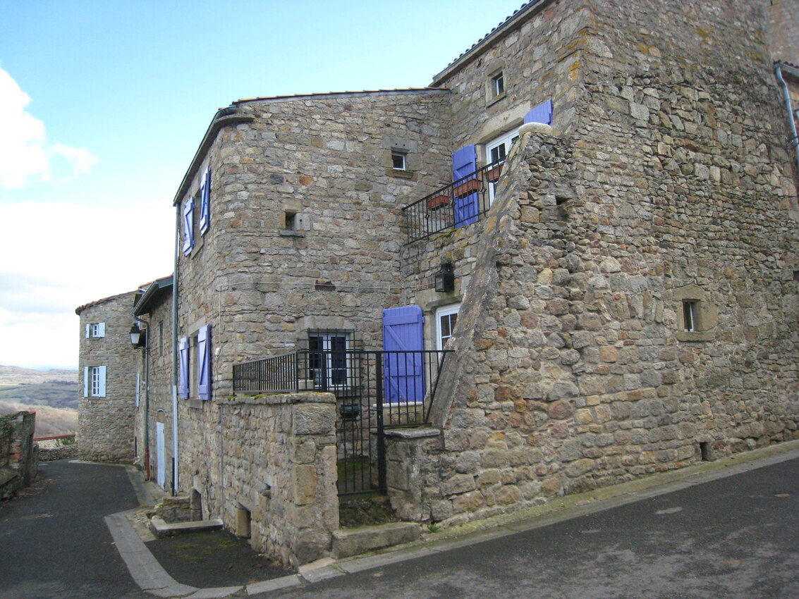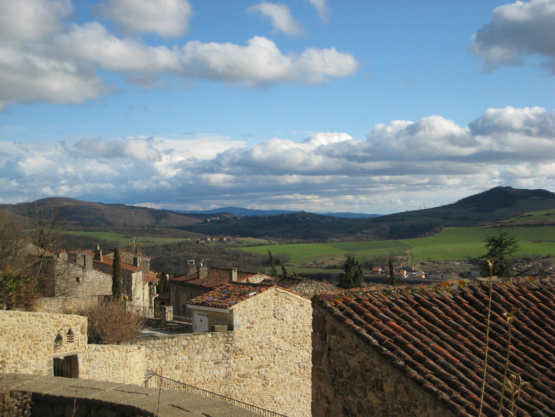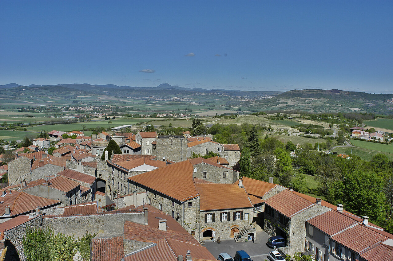 Le plan de Montpeyroux, très structuré, a été modelé autour et en fonction du château, qui occupe le sommet du relief et dont le gros donjon circulaire (un des plus beaux de l’Auvergne) et ses dépendances s'élèvent dans une basse-cour elliptique (le tracé en est marqué dans le parcellaire par une auréole de maisons et de rues). L'ensemble du village est enfermé dans une vaste enceinte flanquée de tours, à laquelle pourrait renvoyer la mention de la fin du XIVe siècle. L'église, mentionnée depuis le XVIIe siècle et longtemps succursale de celle de Coudes, a été reconstruite au milieu du XIXe siècle. Gabriel Fournier,